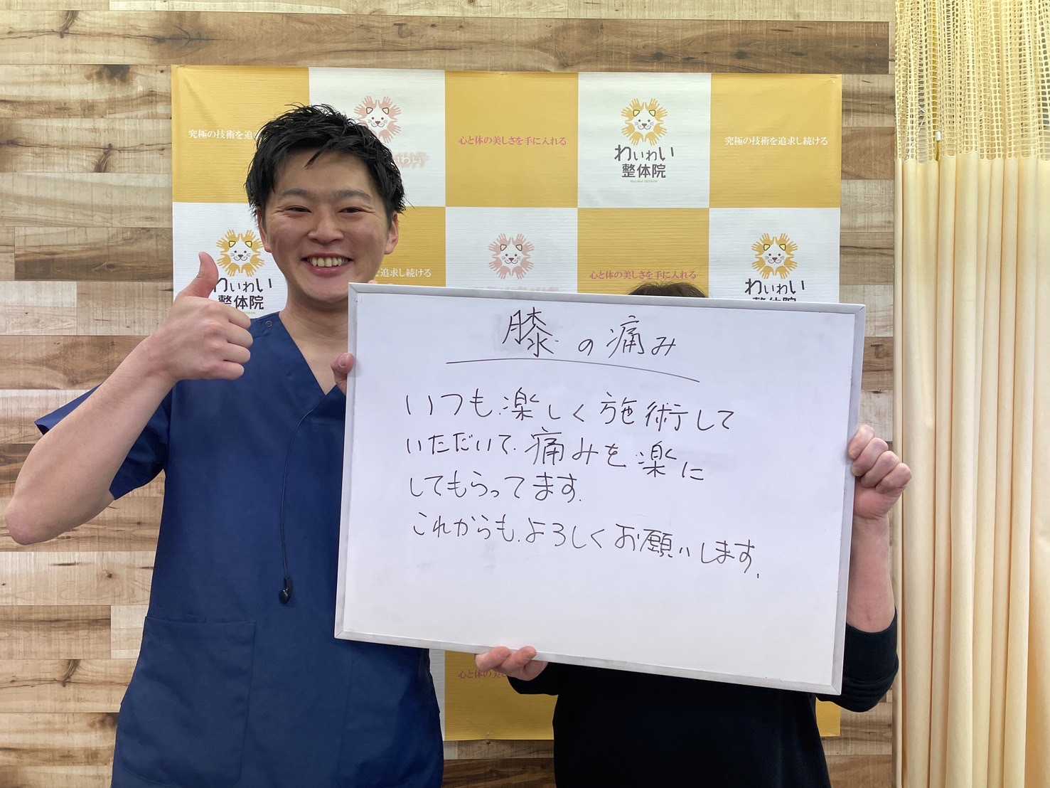 ~膝の痛み~ いつも楽しく施術していただいて痛みを楽にしてもらってます。 これからもよろしくお願いします。 ※効果には個人差があります