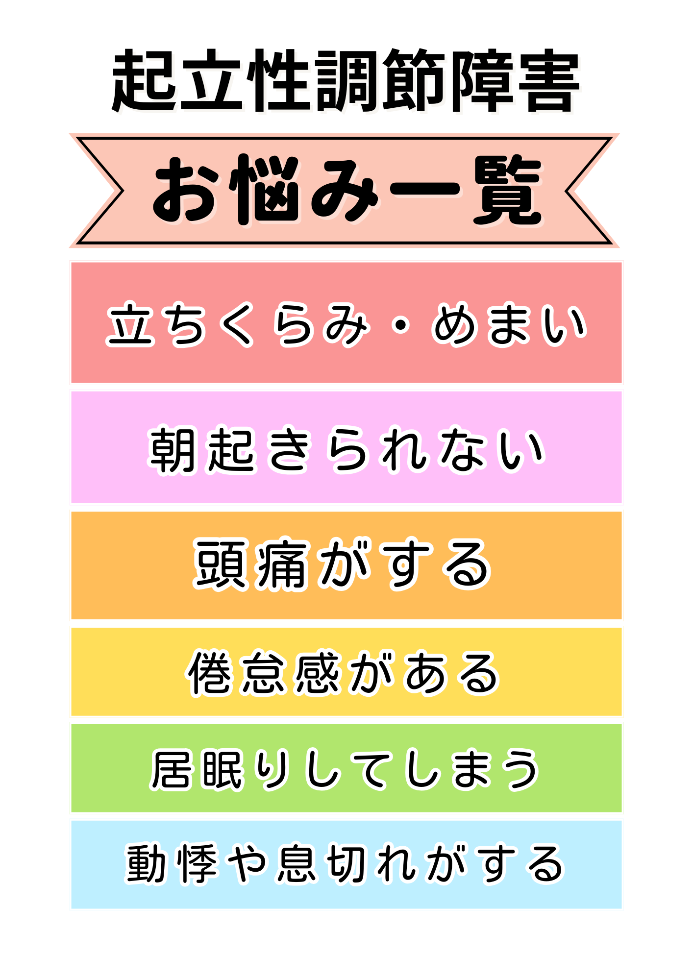 放置した場合、めまいや立ちくらみ、頭痛などの症状が悪化することが考えられます。 朝起き上がることができなくなり、1日中ベッド上で過ごすことになったりと、社会生活に大きな影響を及ぼす可能性があります。 状態が悪化してしまうと、治療しても改善することが難しくなるため、早期受診、早期治療が非常に重要です!